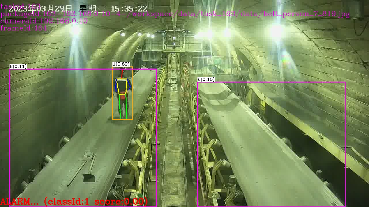 皮帶載人、跨越識別算法是在檢測區域內,識別礦山傳送帶載人、人員跨越傳送帶行為,輸出報警信息。