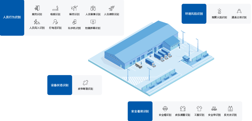通過智能視頻分析系統,實時對信息進行智能化分析和展示,對監管員工異常行為、設備異常及時做出響應,合理充分對人員、設備有效管理、進而實現生產效率的提升。