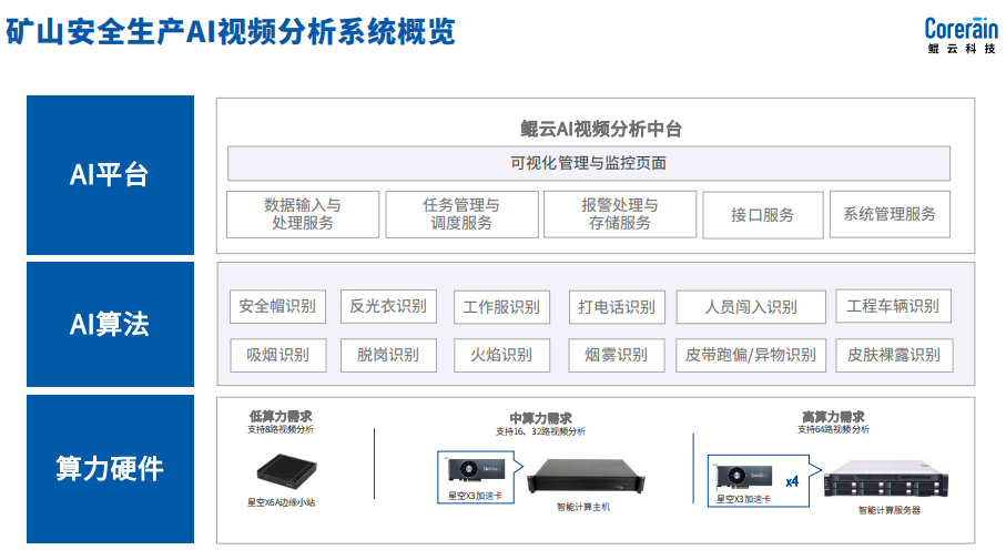 為提高礦山企業(yè)的安全性能,幫助礦山企業(yè)進(jìn)一步優(yōu)化礦山管理,推進(jìn)礦山安全生產(chǎn)的全面標(biāo)準(zhǔn)化,鯤云科技提供深入行業(yè)場景的智慧礦山解決方案,提供深入行業(yè)場景的算法、自主研發(fā)的算力產(chǎn)品和視頻分析管理平臺。采用AI視頻分析技術(shù)可對安全帽識別、反光衣識別、工作服識別、打電話識別、人員闖入識別、工程車輛識別、吸煙識別、脫崗識別、火焰識別、煙霧識別、皮帶跑偏/異物識別、皮膚裸露識別等違規(guī)狀態(tài)實(shí)時識別,快速感知、超前預(yù)警。