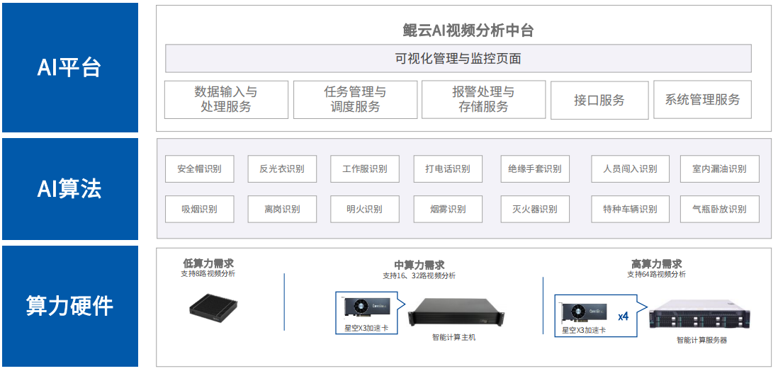 針對油氣田企業(yè)生產(chǎn)性質(zhì)、作業(yè)環(huán)境、站場風險等特點,安全環(huán)保院牽頭編制“安眼工程”,加強現(xiàn)場風險監(jiān)測的技術(shù)性視頻智能化提升。鯤云科技提供軟硬一體的智慧解決方案,通過視頻技術(shù)(IoT)+人工智能(AI)技術(shù),對安全帽佩戴、原油泄漏、煙霧火焰、外來人員闖入、違規(guī)抽煙等生產(chǎn)場景數(shù)據(jù)進行自動化巡檢與報警反饋,重點面向鉆井、井下作業(yè)、工程建設、生產(chǎn)站場等工作現(xiàn)場, 幫助油田實現(xiàn)全面感知、預測預警、數(shù)據(jù)驅(qū)動、協(xié)同優(yōu)化,搭建智能化管控框架和創(chuàng)新發(fā)展模式,推動高效運營、綠色安全,為油田業(yè)務高效發(fā)展提供有力支撐。
