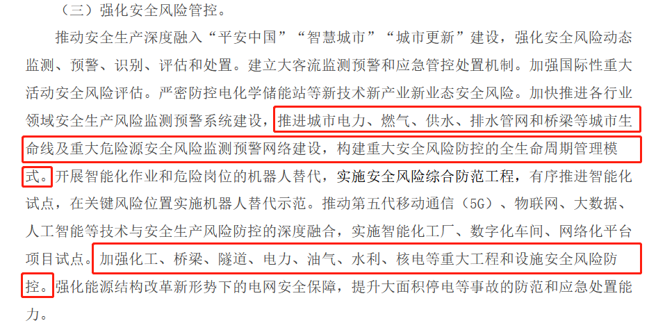 根據(jù)《十四五國家安全生產(chǎn)規(guī)劃》中提出,推動安全生產(chǎn)深度融入“平安中國”“智慧城市”“城市更新”建設(shè),強化安全風險動態(tài)監(jiān)測、預警、識別、評估和處置。推進城市電力、燃氣、供水、排水管網(wǎng)和橋梁等城市生命線及重大危險源安全風險監(jiān)測預警網(wǎng)絡(luò)建設(shè),構(gòu)建重大安全風險防控的全生命周期管理模式。