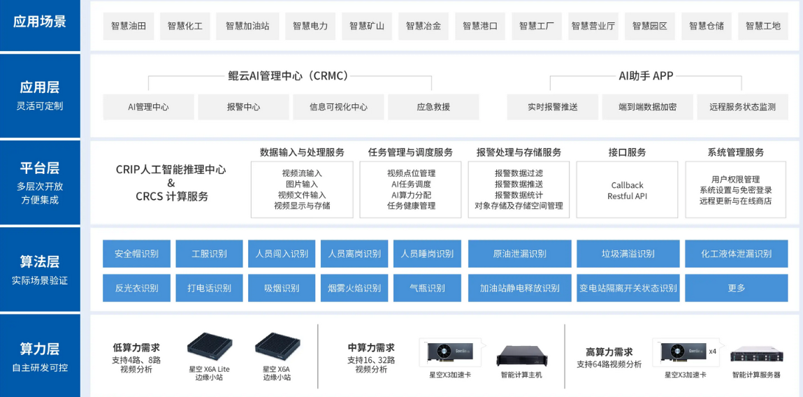 鯤云AI視頻分析平臺經過多次的技術和算法的升級,可以為多個行業提供更加智能化的解決方案,在安防領域,視頻分析平臺可以自動化對人員、物品、環境進行監測,已廣泛落地于油田、電力、化工、加油站、港口、礦山、糧庫、工地、工廠等多個行業,可以通過實際行業需求部署特定的AI算法,幫助企業及時發現安全隱患,快速做出處置動作,避免安全事件發生,滿足應急管理對企業安全生產的防護要求,提升企業安全生產管理能力。