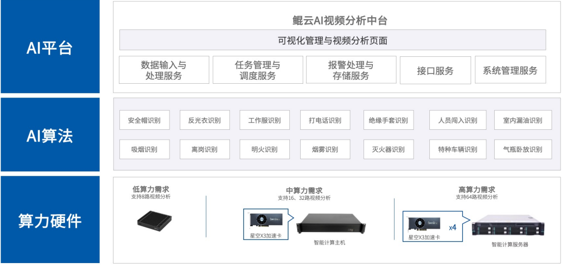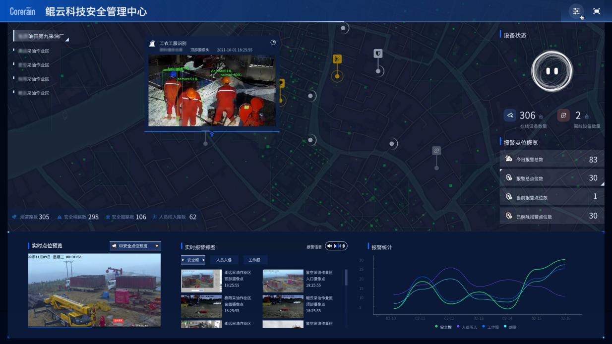 針對油氣田企業(yè)生產性質、作業(yè)環(huán)境、站場風險等特點,鯤云科技提供軟硬一體的智慧油田解決方案。幫助油田企業(yè)安全生產管理智能化轉型,建設油田施工智慧監(jiān)管平臺,AI視覺分析能力的建設是極為重要的一環(huán)。鯤云智慧油田遵循充分利舊降本的原則,部署AI算法的AI邊緣計算盒子或AI服務器,連接油田原有的攝像頭,通過AI視頻分析技術,對安全帽佩戴、原油泄漏、煙霧火焰、外來人員闖入、違規(guī)抽煙等生產場景數據進行自動化巡檢與報警反饋,實現(xiàn)針對性監(jiān)督和預防性控制。