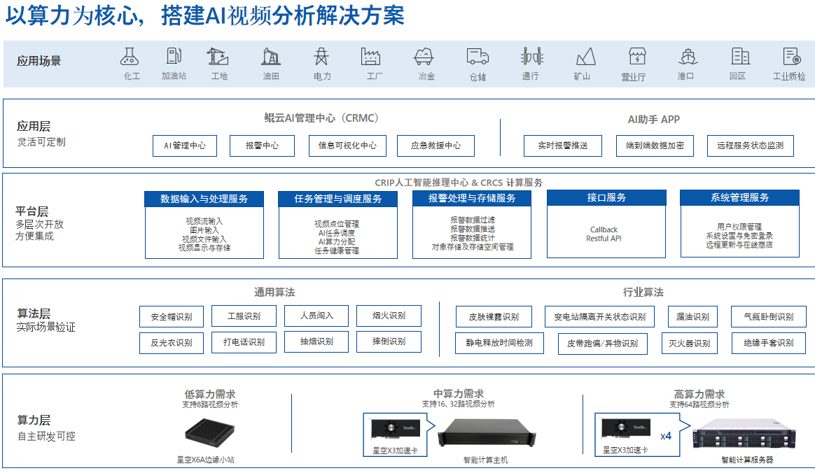 作為技術領先的AI算力和AI視頻分析服務商,鯤云智能預警監測系統已服務上千家行業頭部企業,成功助力企業智能化升級,提高了安全生產水平。企業智能預警監測系統具備以下幾個特點: