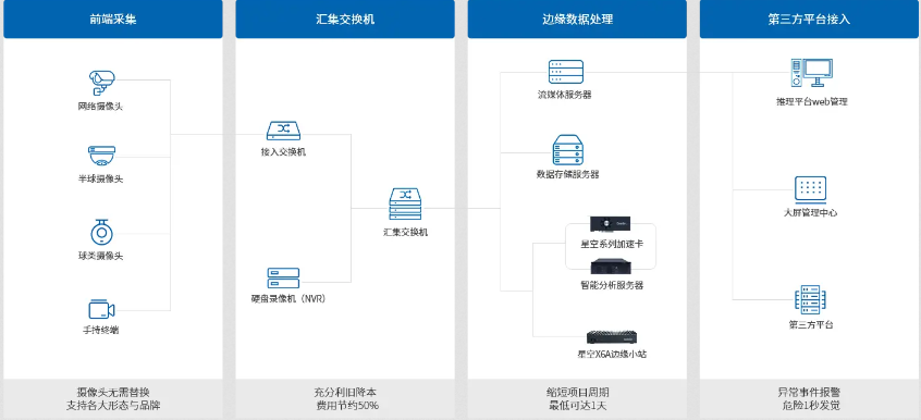 鯤云與華北市級智慧工地管理平臺合作,每個工地部署 1 個盒子,接入500路攝像機視頻流進行分析,采用安全帽檢測、反光背心識別、煙霧火焰識別、人員闖入識別等算法,實時語音報警提醒,構建危險快速響應機制,并自動留存相關圖像資料,加強工地安全管理人員的工作效率,滿足智能化建設要求。