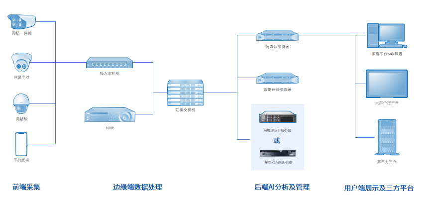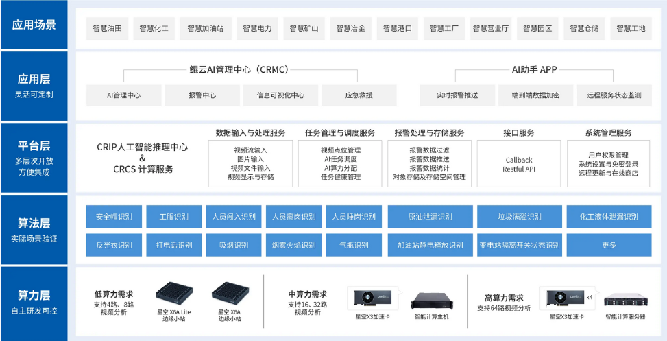 在數(shù)字化改革的背景下,為貫徹國(guó)家政策,助力企業(yè)智能化升級(jí)提高安全生產(chǎn)管理水平,使企業(yè)滿足安全生產(chǎn)要求,鯤云科技提供了AI監(jiān)測(cè)解決方案。通過(guò)對(duì)企業(yè)現(xiàn)場(chǎng)的攝像頭進(jìn)行升級(jí)改造,利用部署算法的AI邊緣盒子通過(guò)接入前端監(jiān)測(cè)攝像頭,從而實(shí)現(xiàn)數(shù)據(jù)的定時(shí)采集上報(bào),通過(guò)內(nèi)網(wǎng)或者4G形式傳輸至AI推理中臺(tái),實(shí)時(shí)對(duì)取流視頻識(shí)別分析,一旦發(fā)現(xiàn)異常進(jìn)行報(bào)警推送至管理終端,從而達(dá)到智慧監(jiān)察的目的。