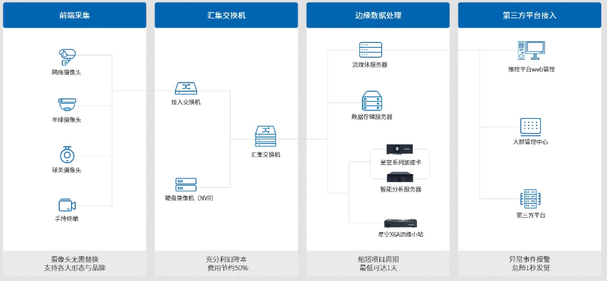 為貫徹國家礦山安監局及各地區制定的礦山安全生產重大風險防控建設相關政策,實現礦山視頻AI技術應用落地,鯤云科技提供了傳統礦山向智慧礦山轉型的礦山智能化解決方案,建設礦山視頻AI監測系統,在算力、算法、平臺、應用四個層面上給礦山賦能。該方案在原有安監系統上增加支持4-64路視頻分析實際路數需求的AI邊緣設備,部署經過實際場景驗證的成熟AI算法,采集前端攝像頭取流的視頻數據,通過web推理平臺對視頻數據推理分析,將異常信息進行報警并推送至管理終端,實現報警信息可視化管理,幫助安監人員快速做出應急管理決策。