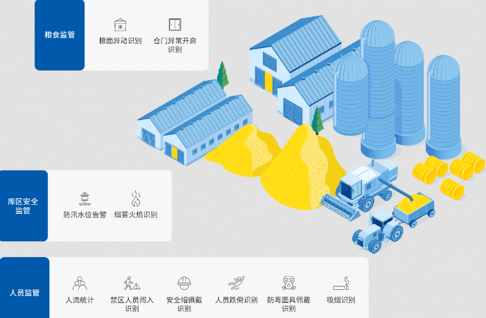 為加速AI在糧庫行業(yè)落地,鯤云科技推出智能化糧倉解決方案,基于人工智能技術(shù),依靠邊緣分析設(shè)備對糧倉攝像頭采集的視頻數(shù)據(jù)進(jìn)行實時識別分析,利用倉內(nèi)人數(shù)識別、倉門開關(guān)識別、糧面異動識別、煙霧火焰識別等AI算法,實現(xiàn)可視化遠(yuǎn)程監(jiān)管、風(fēng)險秒級預(yù)警、精準(zhǔn)化應(yīng)急調(diào)控,助力“科技儲糧、綠色儲糧、安全儲糧”,將糧食安全真正落到實處。