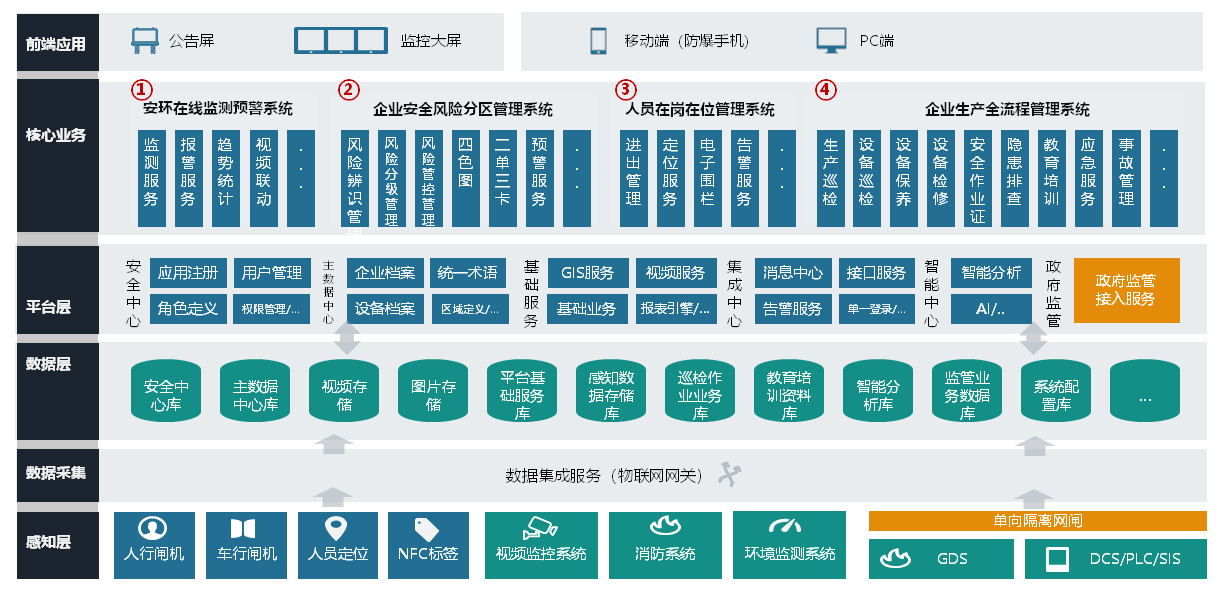 圍繞“安全生產標準化管理”體系建設,利用人工智能技術、GIS技術、人員定位、物聯網監測、視頻聯動等技術,構建風險分級管控與隱患排查治理雙重預防體系,提供重大危險源監測預警、企業安全風險分區管理、企業生產流程管理、人員在崗在位管理等功能,從感知層、數據層、平臺層全面覆蓋工業企業安全生產相關業務,提高企業安全生產管理水平。