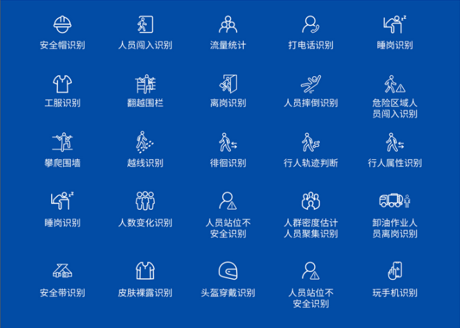 任何一個異常行為都有可能引發安全事故,為企業安全生產能夠得到保障,盡可能地將危險風險控制為零。鯤云科技提供了多種自主研發的行為識別算法:抽煙識別、打電話識別、人員闖入識別、安全帽識別、工衣工服識別、人員睡崗識別、周界入侵、人員離崗識別、玩手機識別、未戴口罩識別、人員摔倒識別等人員行為分析算法,助力企業在人員行為安監工作上成功減員降本,實現全方位智能化識別。
