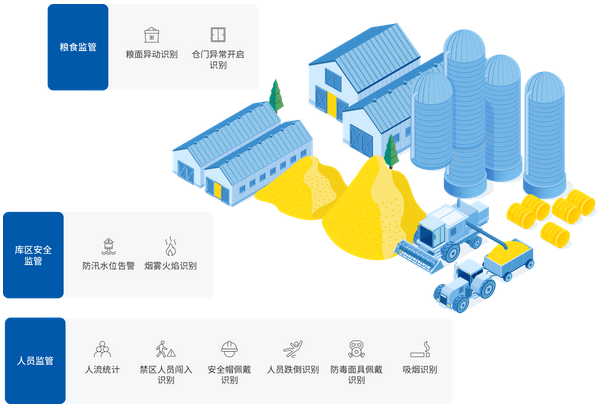 為解決糧食異動、因水受潮、煙火等安全隱患,鯤云科技推出集監測、分析、預警的智慧糧庫綜合管理平臺。基于人工智能視覺技術,依靠自主研發的深度學習算法和高性能硬件產品,在糧庫原有的攝像頭上進行賦能,利用倉內人數識別、倉門開關識別、糧面異動識別、煙霧火焰識別等AI算法,對攝像頭采集的圖像視頻進行實時識別分析,確保糧食品質安全。