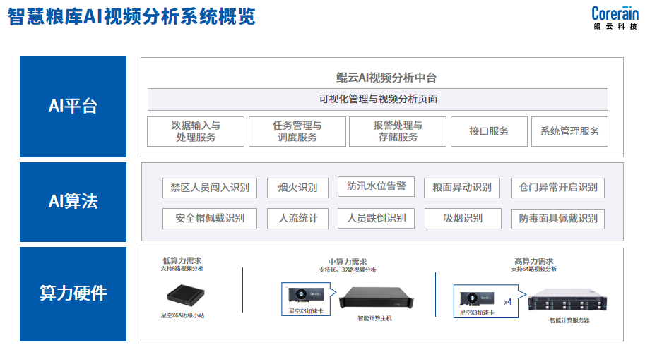 為健全糧食安全和物資儲備保障體系,鯤云科技智慧糧庫AI視頻分析方案,利用倉內人數識別、倉門開關識別、糧面異動識別、煙霧火焰識別等AI算法,加快人工智能技術在糧庫的應用,實現可視化遠程監管、精準化應急調控,助力“科技儲糧、綠色儲糧、安全儲糧”,將糧食安全真正落到實處。