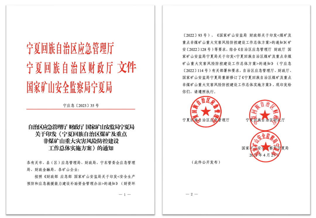 其中,寧夏回族自治區應急管理廳、財政廳、 國家礦山安監局寧夏局重新修訂了《寧夏回族自治區煤礦及重點非煤礦山重大災害風險防控建設工作總體實施方案》。