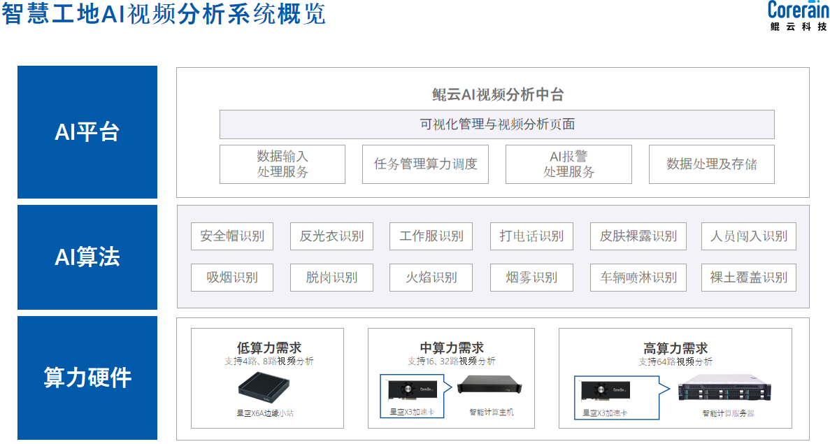 鯤云智能監測系統采用充分利舊原則,利用AI邊緣分析設備連接前端攝像頭的邊緣部署方式,并連接AI監管平臺和顯示終端形成一套完整的監測系統。通過攝像頭采集實時畫面,并對畫面中的目標進行檢測和分析,并將數據傳輸到AI推理中心和管理終端對預警結果進行直觀展示,以實現對安全隱患的及時預警和處理。
