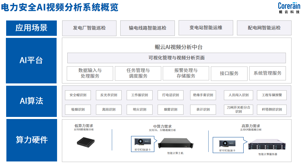 針對發電、輸電、變電、配電等關鍵電力行業場景,鯤云科技提供算力算法平臺一體化智慧電力系統,智慧電力系統將傳統電力運維系統與人工智能技術深度融合,利用安全帽識別、反光衣識別、絕緣手套識別、離崗識別、明火識別、煙霧識別、刀閘開關柜分合識別、桿塔倒伏識別等AI算法,對電力工程現場進行全面、實時監測,及時發現安全隱患,當監測到違規操作或其他安全隱患時,系統會自動發出報警信號,提醒相關人員進行處理,防止事故的發生。