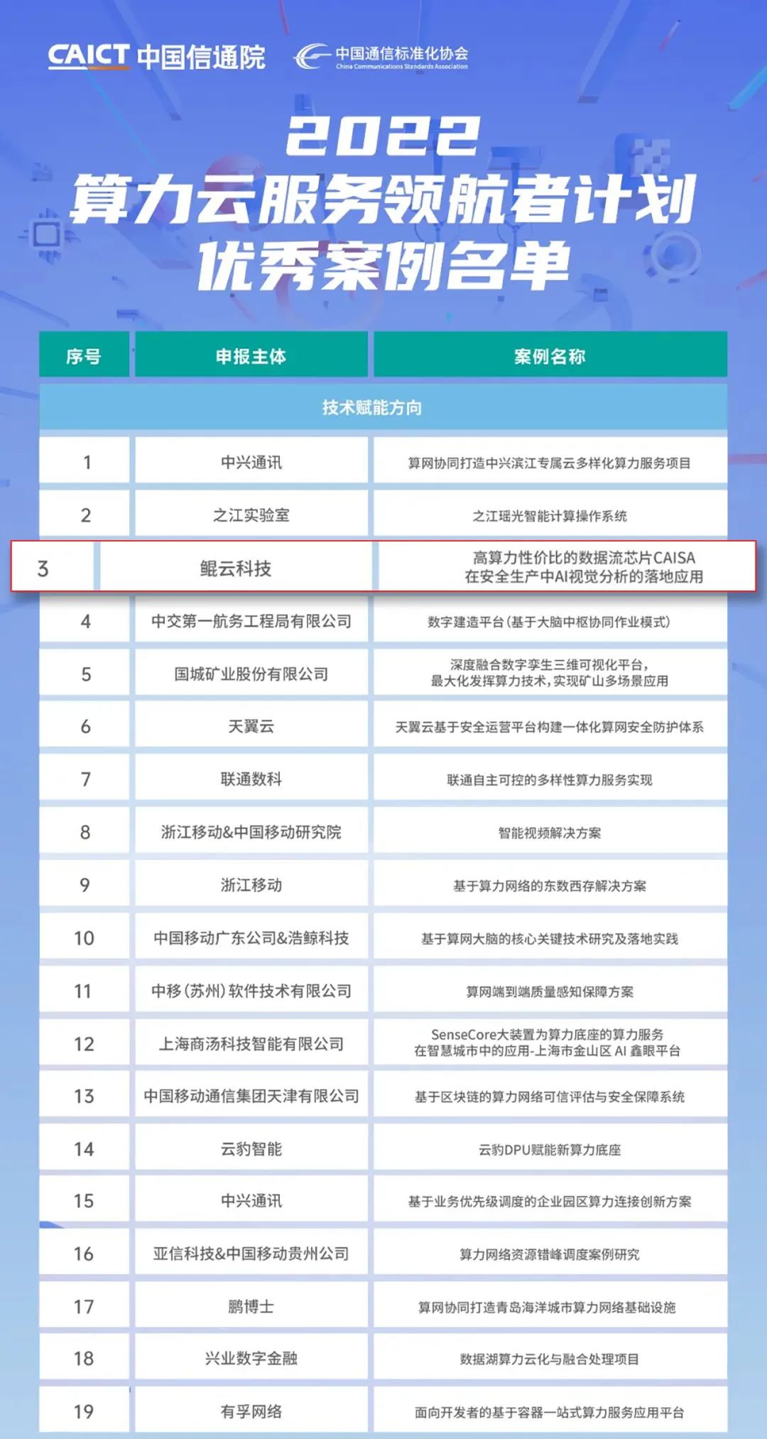 3月29日,由中國信息通信研究院、中國通信標準化協會主辦的“2023企業上云暨算力融合產業大會”在北京召開,共同探討算力服務如何構建產業生態,加速技術創新應用,提升整體服務水平。鯤云科技憑借“高算力性價比的數據流芯片CAISA在安全生產AI視覺分析中的落地應用”,成功入選“算力云服務領航者計劃”技術賦能方向優秀案例。