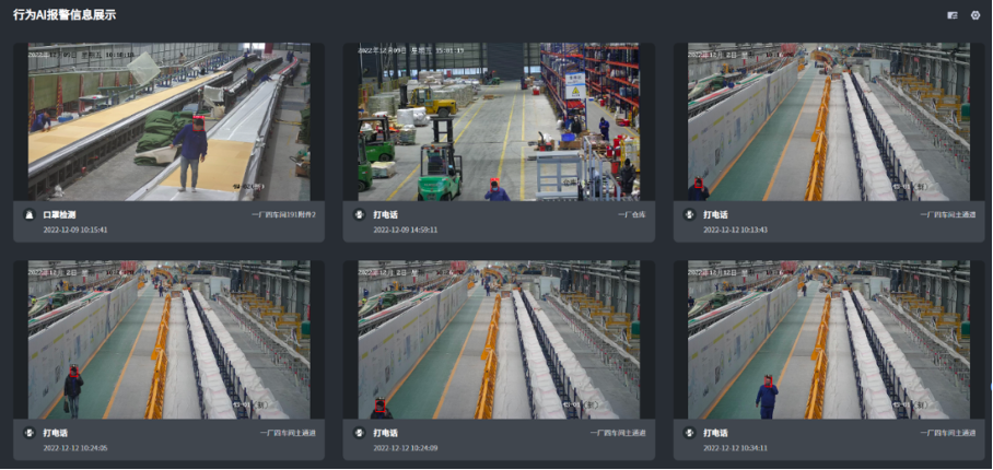 一期試點項目確認在鹽城基地的成型車間、后處理車間、倉儲物流車間、化學品庫、危廢庫、垃圾場等場景根據管理需求部署未佩戴安全帽識別、未佩戴防塵口罩、打電話識別、攀爬欄桿作業識別、吊物作業下停留、煙火識別等鯤云通用AI算法。