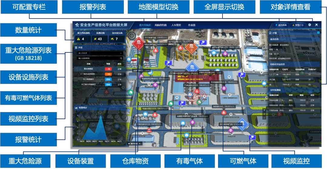 從化工企業的真實需求出發,方案圍繞“重大危險源”建設設備環境感知一張圖,幫助客戶在制度合規、管理提效、及時預警、真實記錄業務臺賬等方面完成系統搭建。系統所有的業務功能都遵循 PDCA 的模式,策劃-實施-檢查-持續改進,確保企業安全管理體系能不斷優化完善,形成了“人防+物防+技防”的安全管理機制,實現對化工企業廠區內潛在風險的及時預警和快速響應。