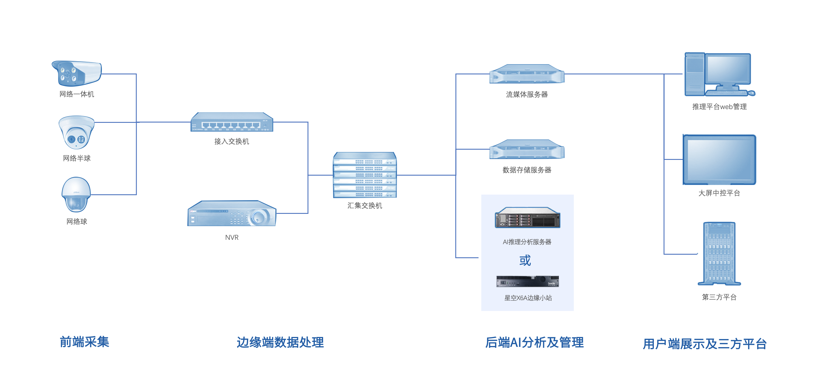 方案充分利舊,可利用制酒車間、制曲車間、磨曲車間、酒庫、灌裝區等場所原有的攝像頭,將接入攝像頭視頻流的智能分析服務器部署在中控室內,使用 AI 視覺分析算法對視頻內現場人員行為及環境進行實時監測,實現一屏看全場、一鍵治違規,快速打造一體化安全生產管控平臺。